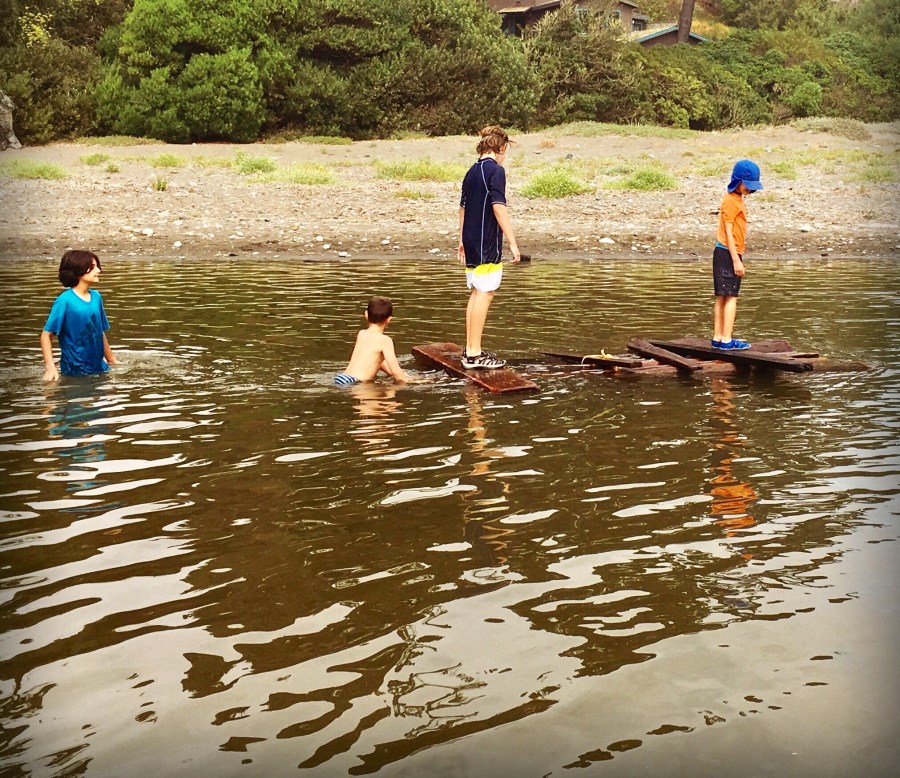 “…I took this picture one day at the beach. It is a floating raft that boys and girls of different ages built out of driftwood and large ribbon kelp that they found. They didn’t all know each other and various kids came and went throughout the day.